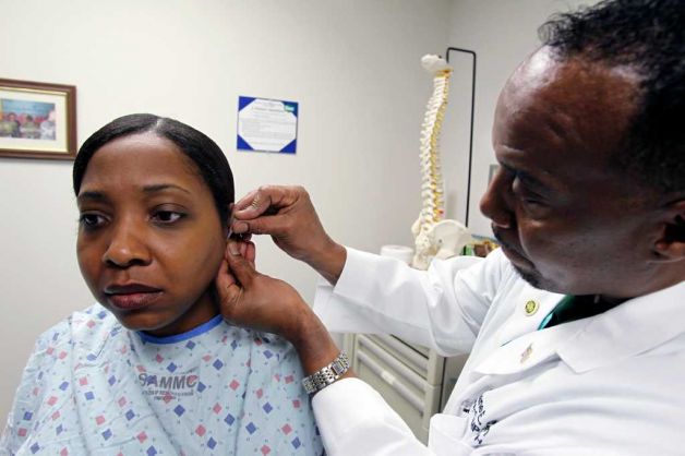 Pain pills are part of the treatment, but in her case they don't last long, so orthopedic physician's assistant Duane Griffin last week performed an acupuncture treatment, injecting small gold needles into selected parts of her ear.